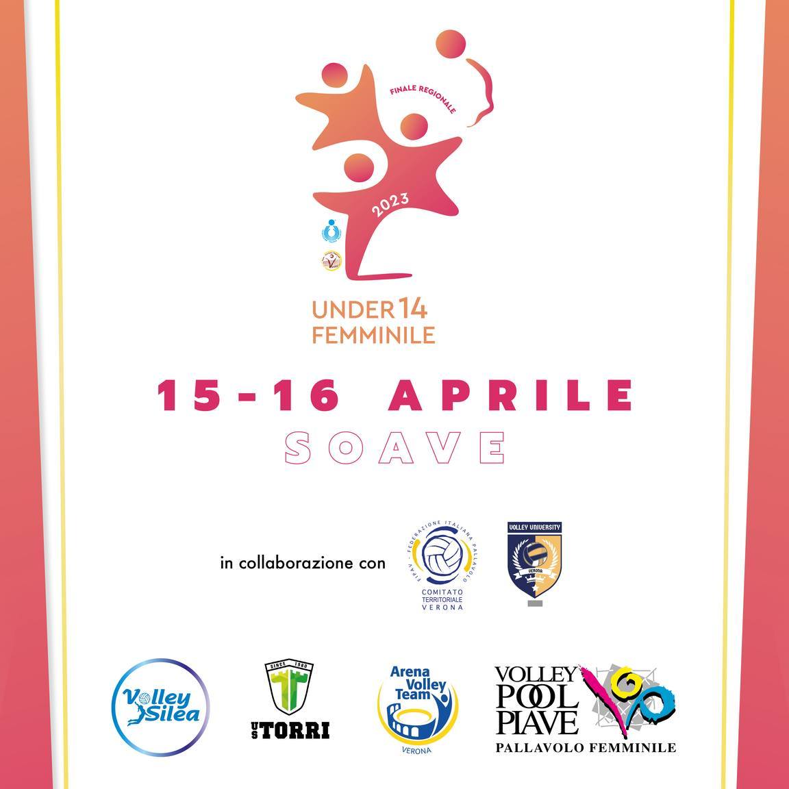 Ad inaugurare la novità assoluta della Super Final è la categoria U14 Femminile.Saranno Volley Silea A.S.D, US TORRI VOLLEY (campione in carica), Arena Volley Team Verona e Volley Pool Piave a contendersi il titolo regionale e l’accesso alle Finali Nazionali in programma a Cesena da 15 al 21 maggio.